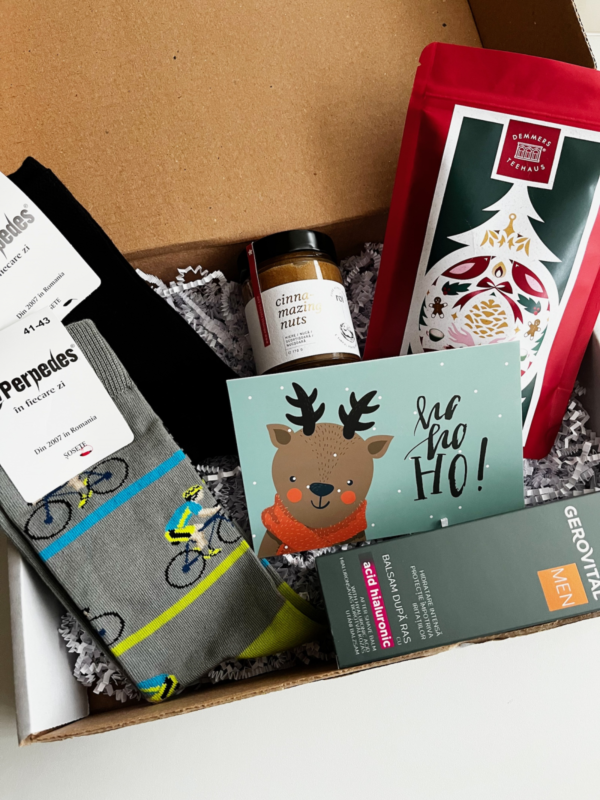 Alungă frigul cu acest cadou plin de căldură! O cutie cu arome îmbietoare de ceai, sosete confortabile pentru zilele lungi petrecute acasă, o cremă de miere cu nuci rumenite și scorțișoară, perfectă pentru momentele de relaxare, și o felicitare pentru a-i arăta cuiva cât de mult îți pasă.