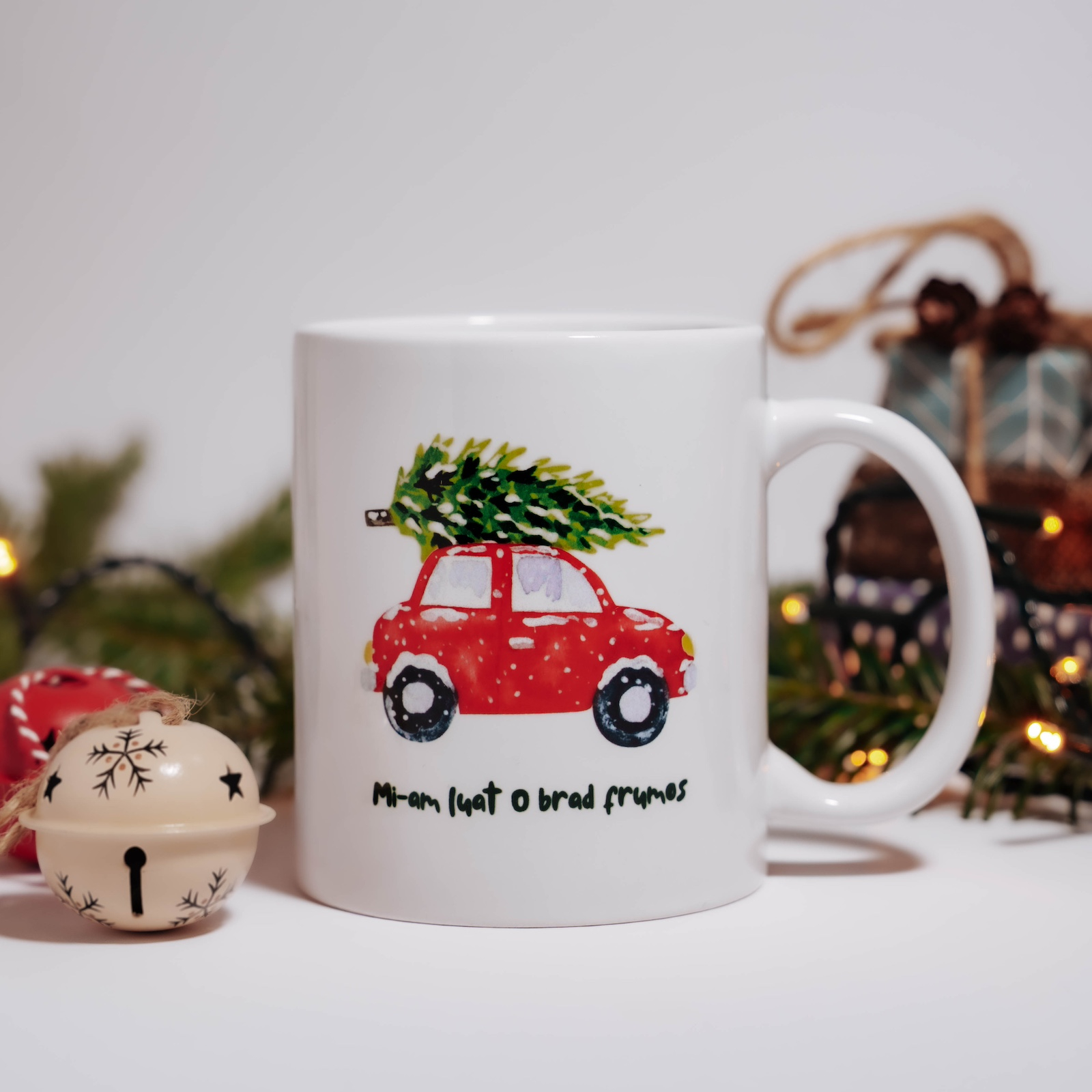 Cană Festivă de Crăciun cu mesajul „Mi-am luat O brad frumos”: Un recipient vesel, perfect pentru băuturile calde de sezon.