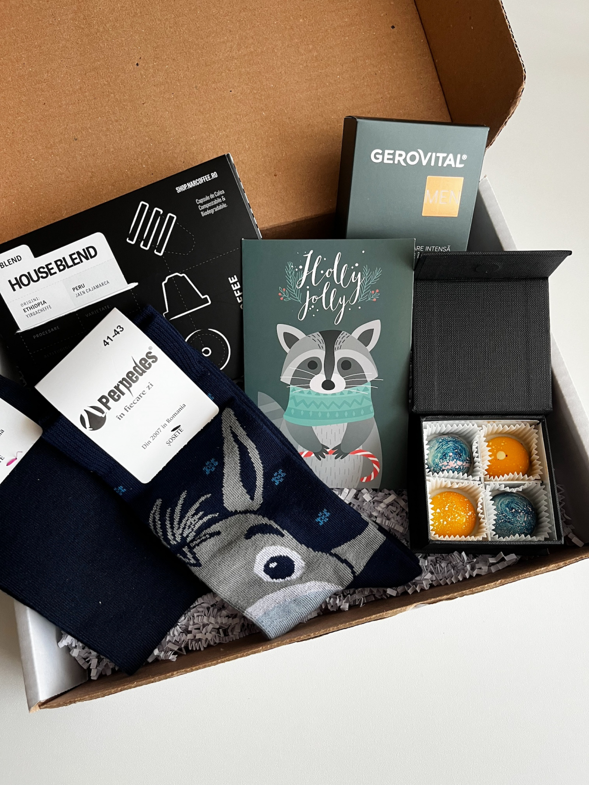 Răsfață-l cu un cadou care spune totul. Acest cadou combină aroma inconfundabilă a cafelei de specialitate, confortul unor șosete haioase, dulceața pralinelor artizanale și parfumul fresh, barbatesc al aftershave ului. Personalizează-l cu un mesaj special și oferă-i o experiență de neuitat.
