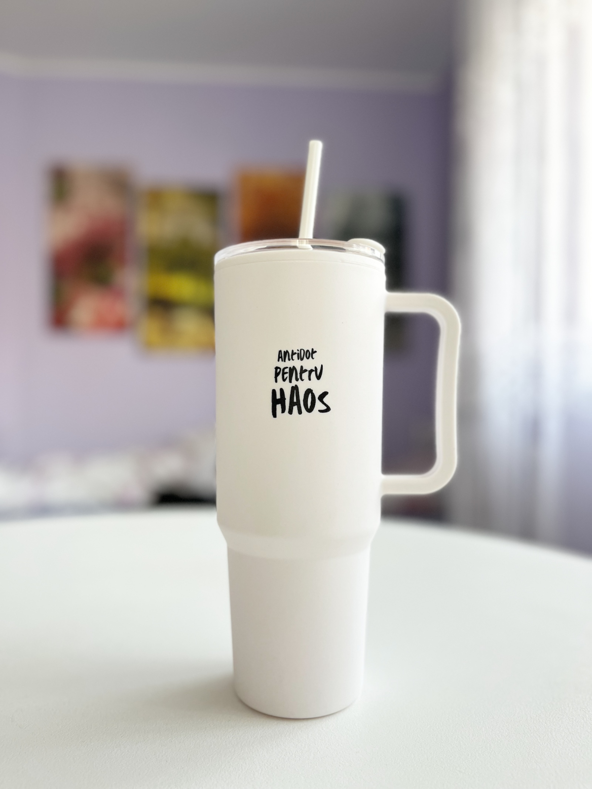 • Cană termică cu mesajul „Antidot pentru haos” – un companion practic și amuzant pentru zilele pline.