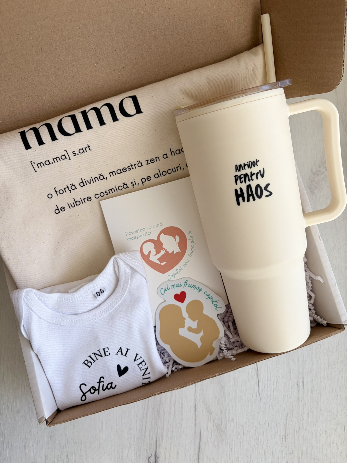 Acest pachet cadou special a fost creat cu multă dragoste și atenție la detalii pentru a sărbători și a susține viitoarele mămici în această călătorie unică. Fiecare produs din cutie este mai mult decât un obiect — este o declarație de dragoste, un ajutor practic și o amintire prețioasă. Ce conține cadoul?