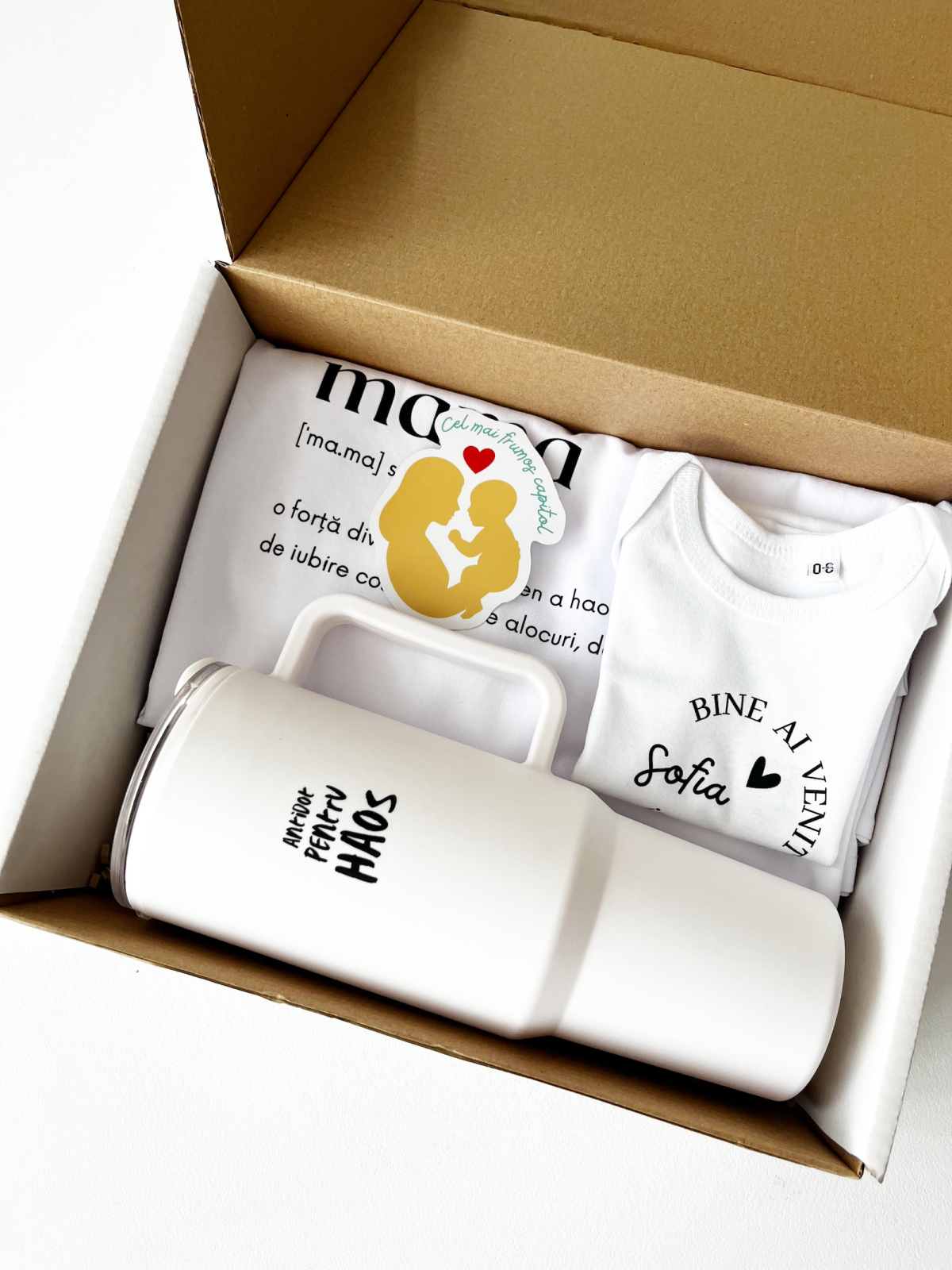 • Cană termică "Antidot pentru Haos": Maternitatea vine cu multe provocări, dar și cu momente de bucurie pură. Acest termos ajută mămicile să se hidrateze și să păstreze cafeaua sau ceaiul calde, amintindu-le că, în mijlocul haosului, există întotdeauna un moment pentru ele.